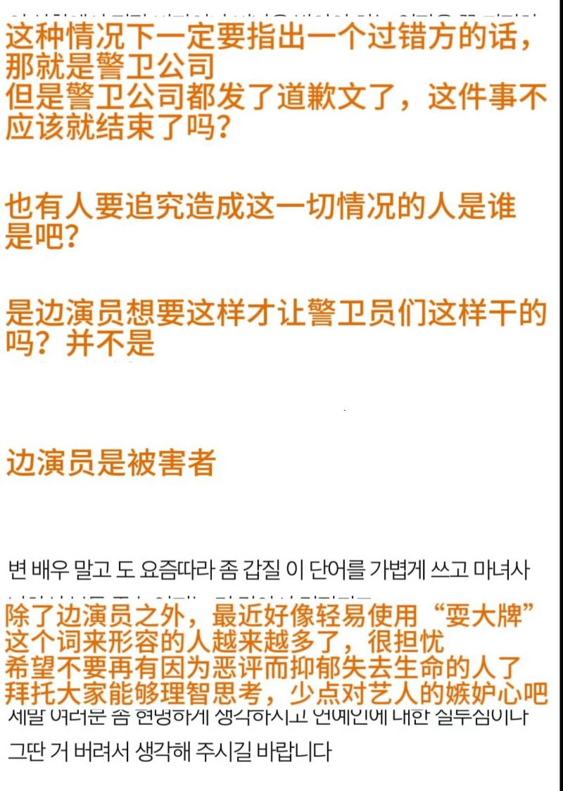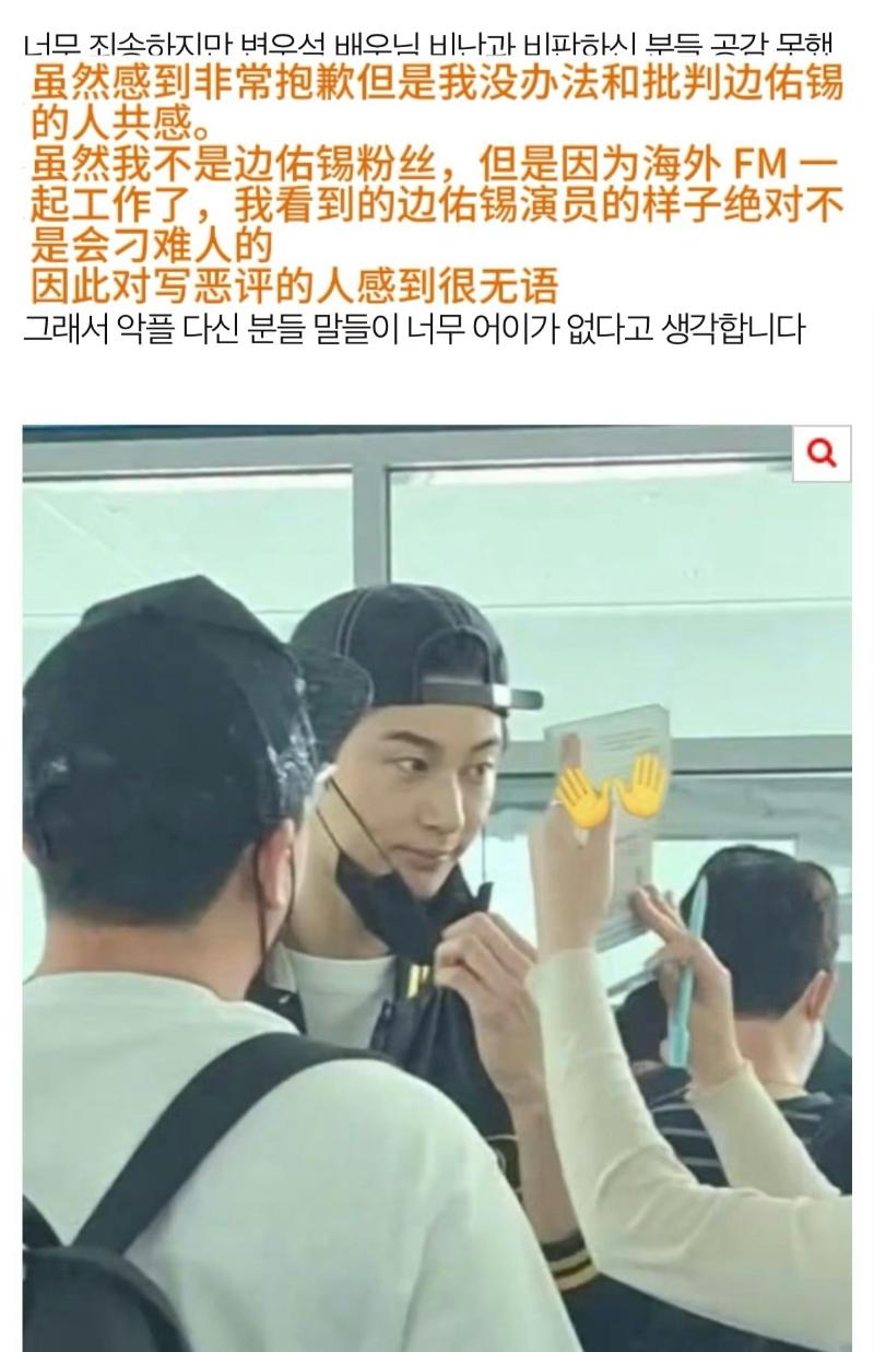 發文中她提及自己沒辦法和批判邊佑錫的人共感,雖然不是邊佑錫的粉絲,但因為在海外一起工作過,所以自己看見的邊佑錫,絕不是會刁難人的人,因此對寫惡評的人感到無語。