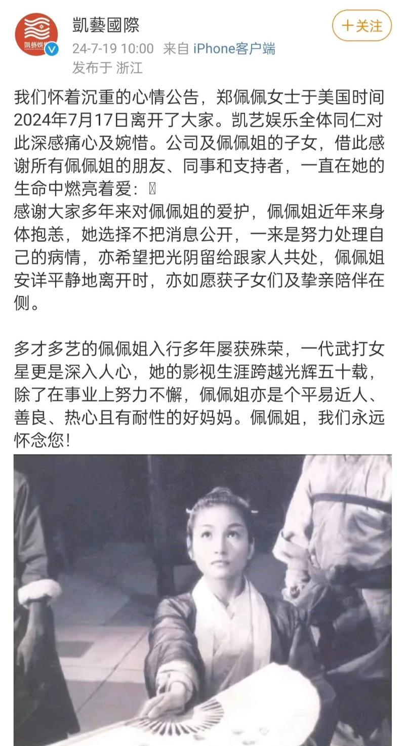 一代武俠影后鄭佩佩去世!捐贈大腦用於醫學研究!眾藝人發文悼念!