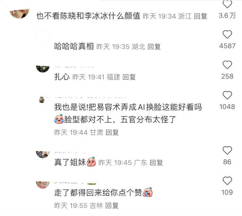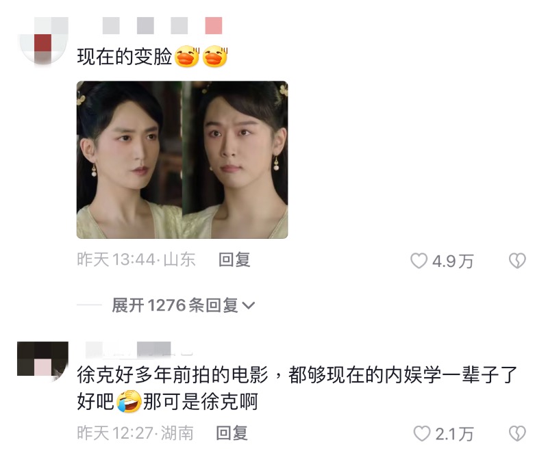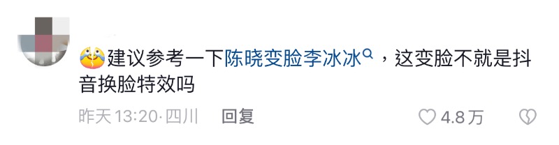 不曉得是不是這個變臉特效真的太炸裂了,整得網友逆反,直接翻出了14年前,也就是徐克在2010年拍攝的《狄仁傑之通天帝國》中,陳曉變臉李冰冰的片段來“當范本“👇
