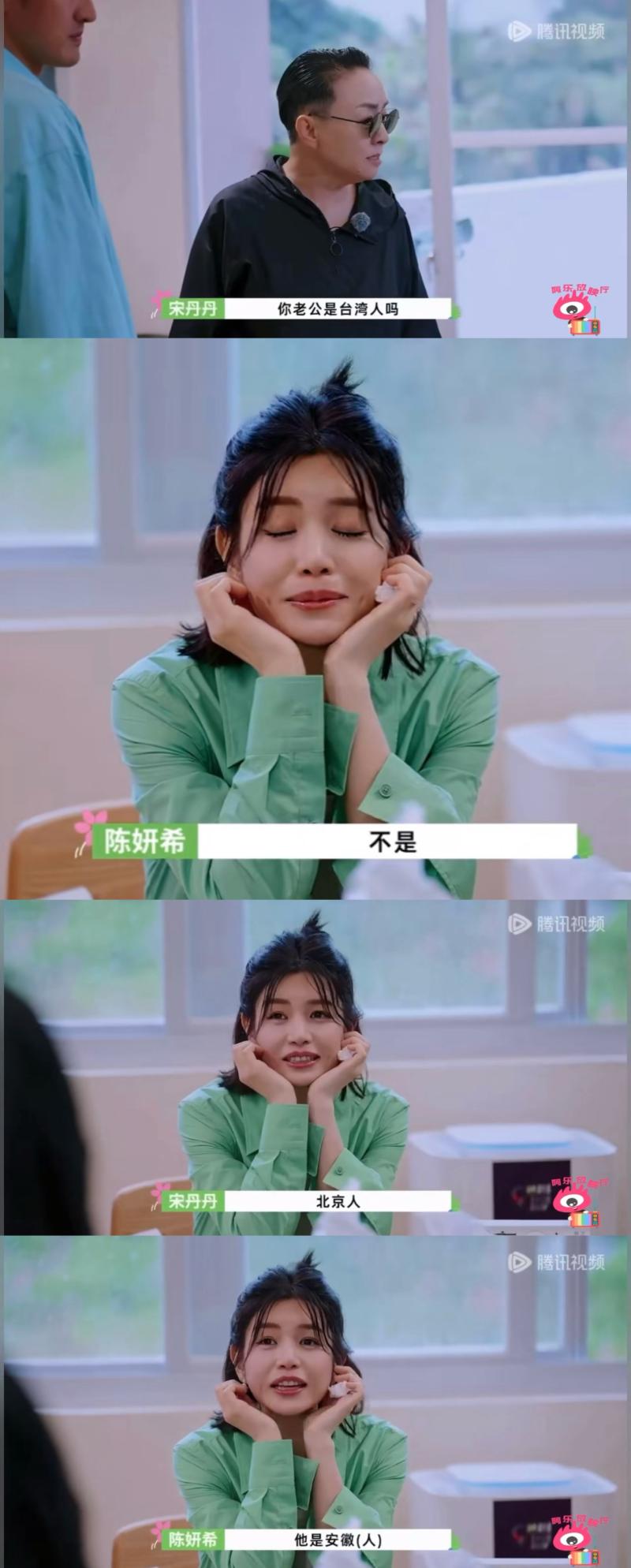 在一旁的宋丹丹就好奇問:「你老公是台灣人?」陳妍希回應:「不是」,丹媽繼續問:「北京人?」陳妍希想了一下,回應是:「安徽人。」