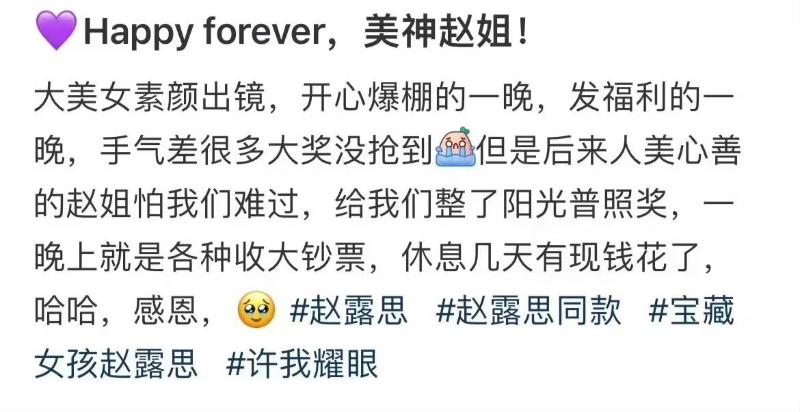 沒錯,跟過趙露思好幾個劇組的化妝師發文,分享了趙露思工作室慶祝成立4週年的照片,當中提到了趙露思擔心出席者沒抽到獎,直接弄了個「陽光普照」獎,「一晚上就是各種收大鈔票」,簡單來說就是人人有份,這句話真的讓人…酸了👇