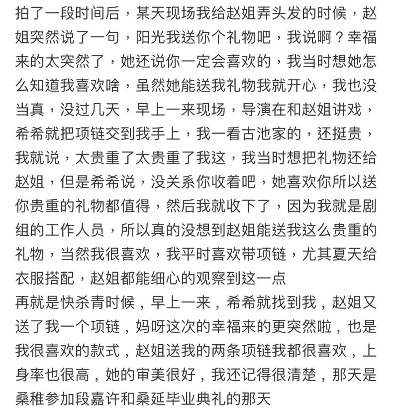 但這已經不是第一次化妝師分享趙露思的「投餵」,第一次在《偷偷藏不住》認識之後,趙露思就主動送過兩次名牌項鏈給這位剛合作的工作人員👇