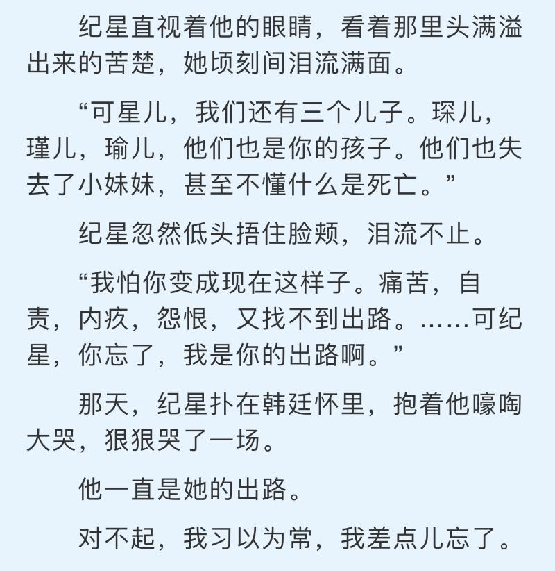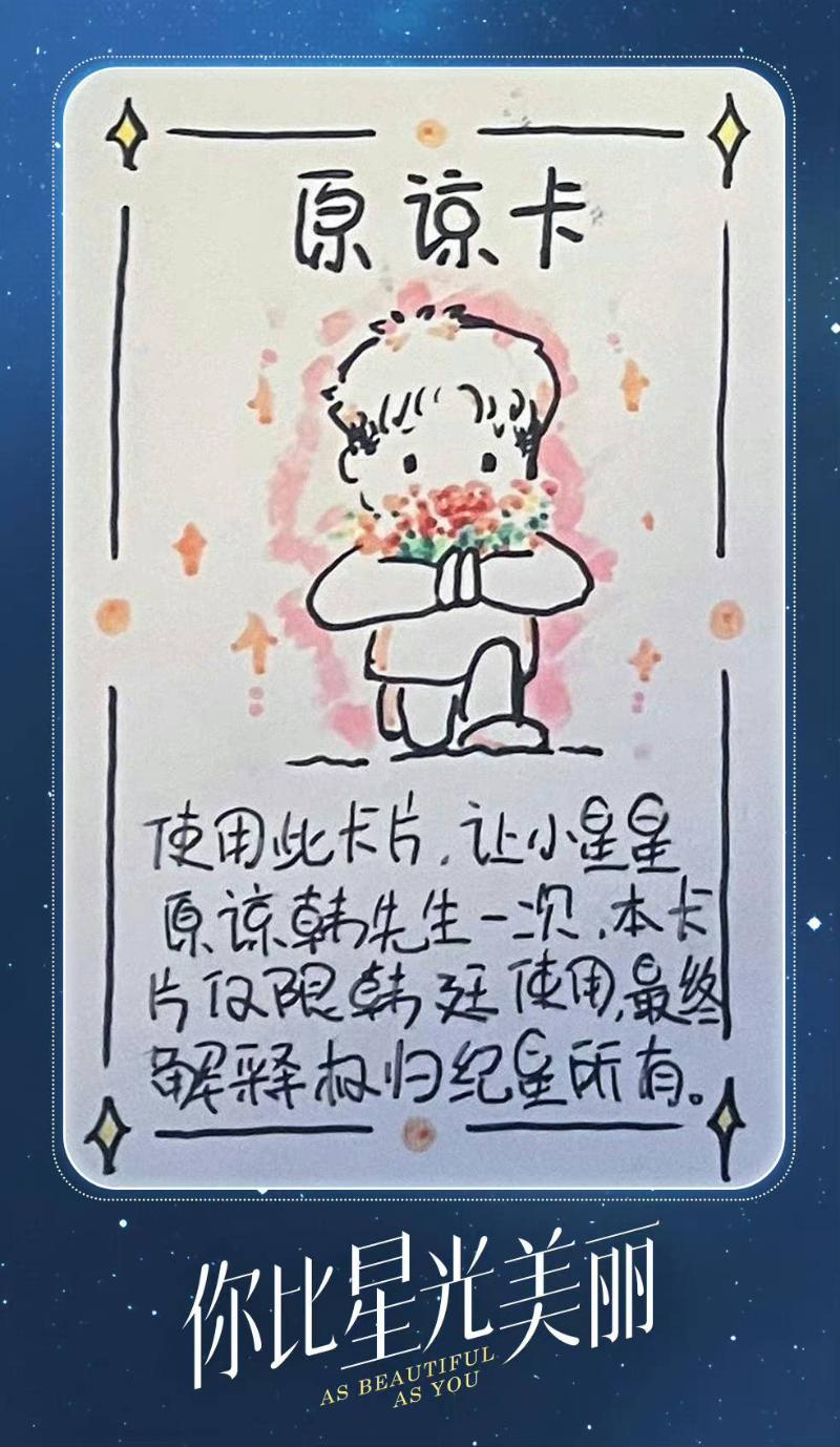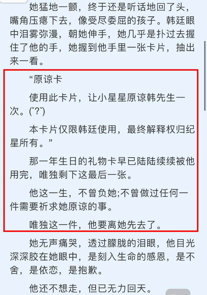 在小說中,韓廷在彌留的時候,拿出了紀星在生日時送給自己的「原諒卡」,祈求紀星原諒自己先離去👇