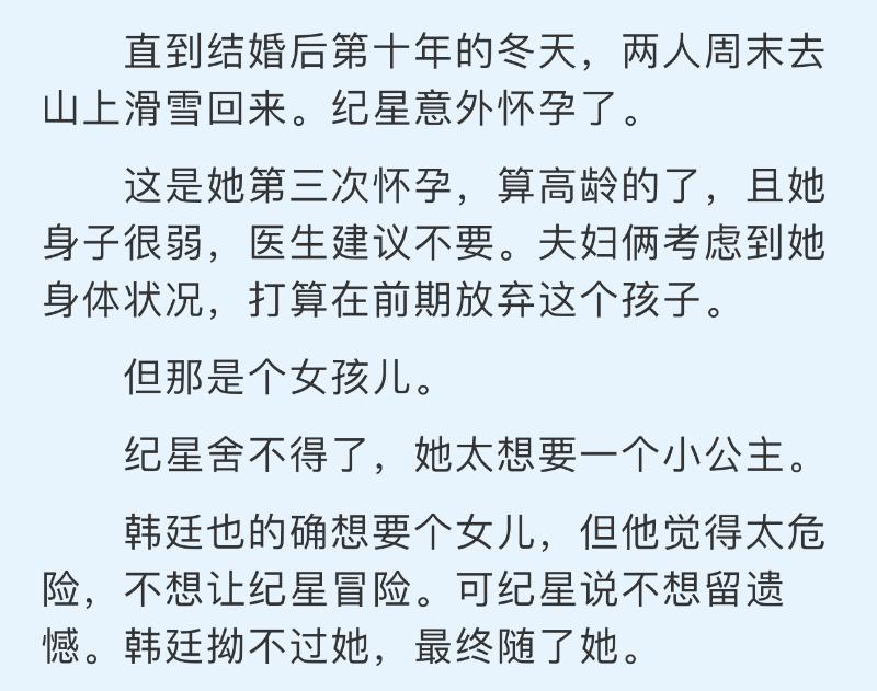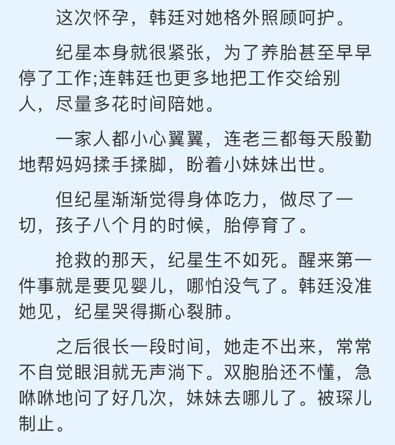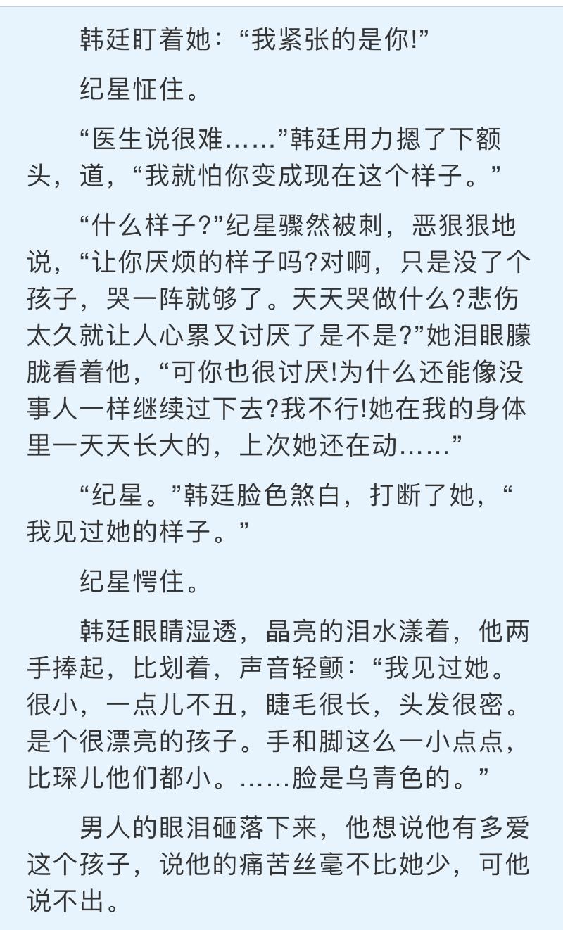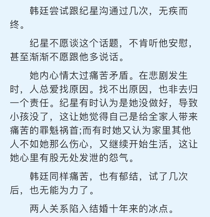 而小說番外最虐的,則是兩人結婚10年之後,紀星又懷孕了,這次終於懷了女兒。可惜的是,在懷孕8個月的時候胎停了,紀星因此患上憂鬱症,兩人婚姻關係陷入超級大危機。