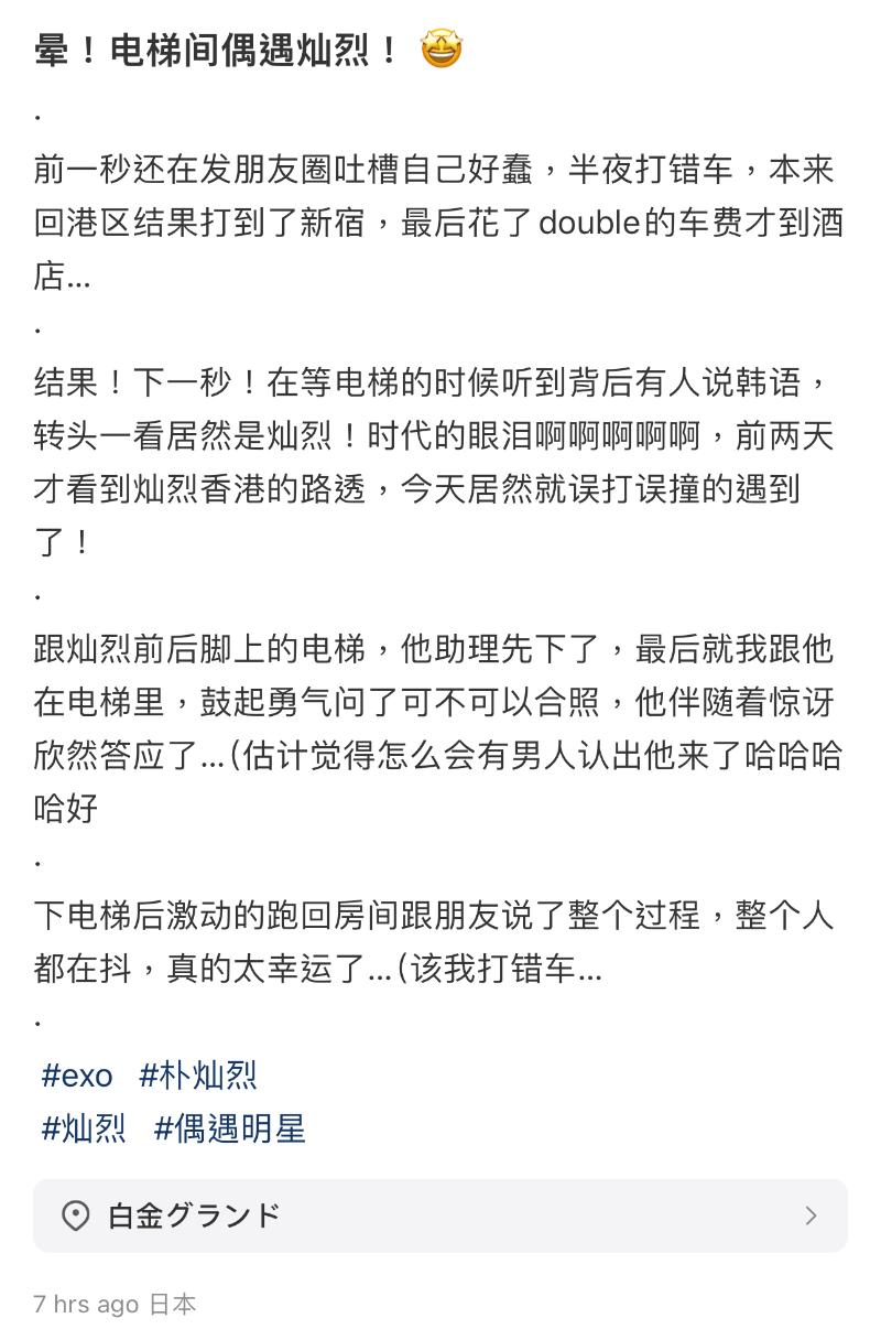 沒想到就有網友,居然在深夜的酒店電梯內巧遇燦烈啊!是噠,來看網友分享,原Po表示自己原本十分倒霉,想搭車去港區結果搭去了新宿,花了雙倍的車費才回到下榻的酒店。