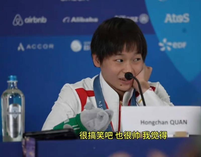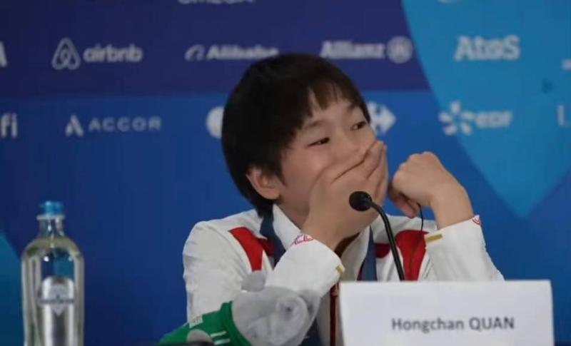 在賽後的記者會上,被稱為妹寶的全紅嬋被問到為什麼會和黃子韜有互動,露出了害羞又驚慌的表情👇