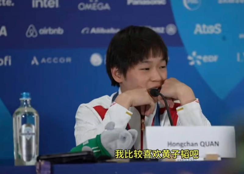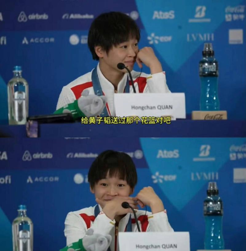在賽後的記者會上,被稱為妹寶的全紅嬋被問到為什麼會和黃子韜有互動,露出了害羞又驚慌的表情👇