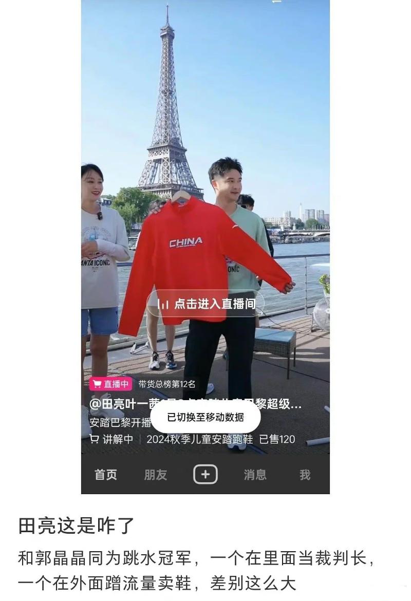 這次的爭議主角,變成了前奧運冠軍田亮!有網友曬出了田亮直播間的截圖,表示田亮帶著女兒森碟、兒子森碗在巴黎鐵塔下直播帶貨!對比同是跳水冠軍的隊友郭晶晶,差別也太大!
