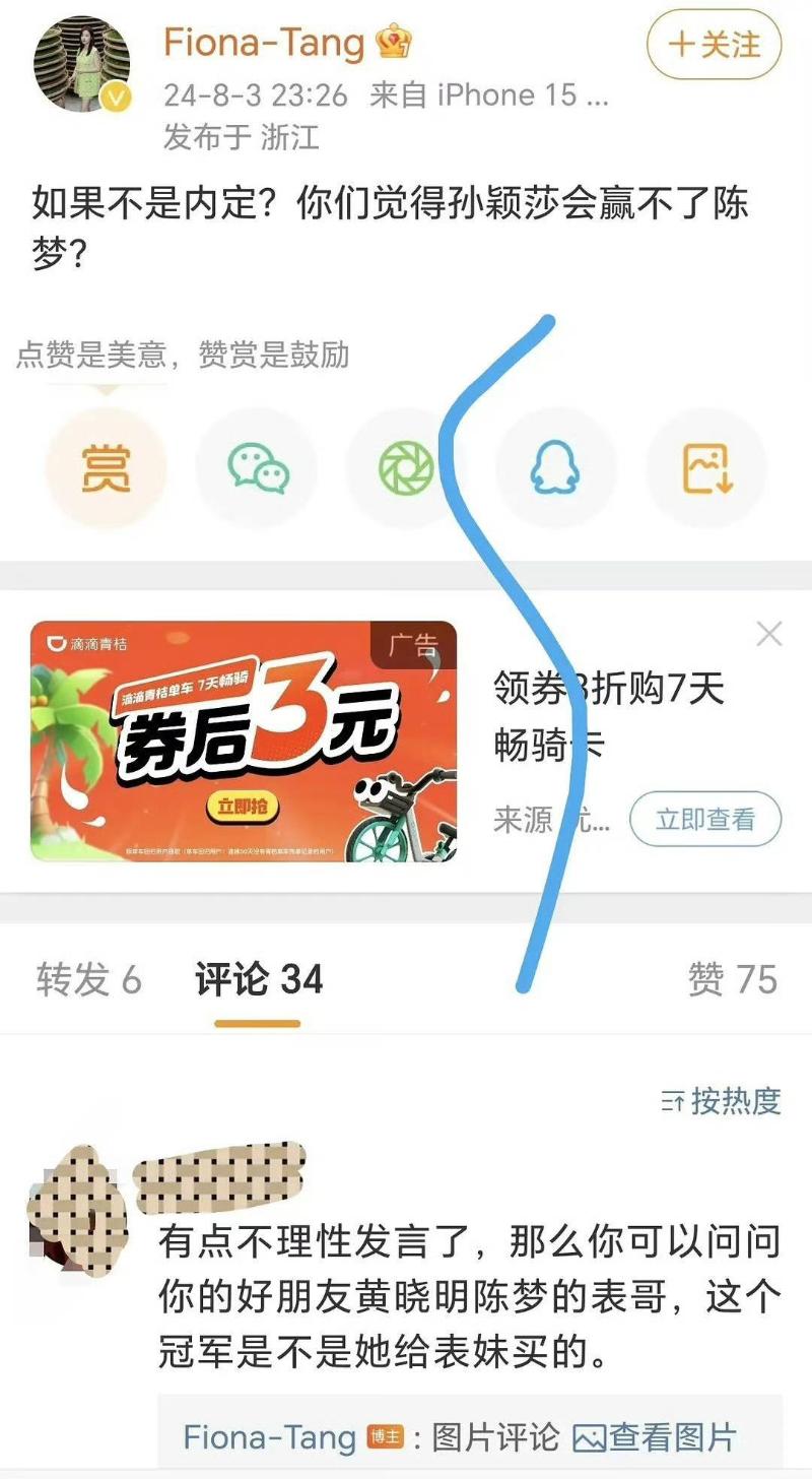 這位傳媒甚至公開在微博發文,質問孫穎莎怎麼會贏不了陳夢?有網友留言表示她發言不理性,讓她去問問好朋友黃曉明:這個冠軍是不是他給陳夢買的?