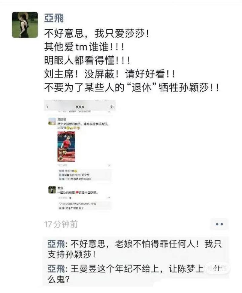 不僅在微博發,黃曉明原來在自己的朋友圈也發了,表示兩個女孩都很優秀。結果有人在他朋友圈評論區說:「不好意思我支持孫穎莎。」還直懟陳夢是“關係戶取勝”!