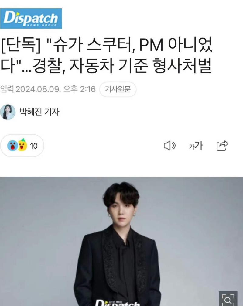 而根據韓媒Dispatch和警方透露,SUGA駕駛的電動踏板車是原動機裝置自行車,車身重量為25kg,與個人移動裝置相似,但由於最高速度可達30km/h,因此將以與汽車酒駕相同的基准受到刑事處罰。
