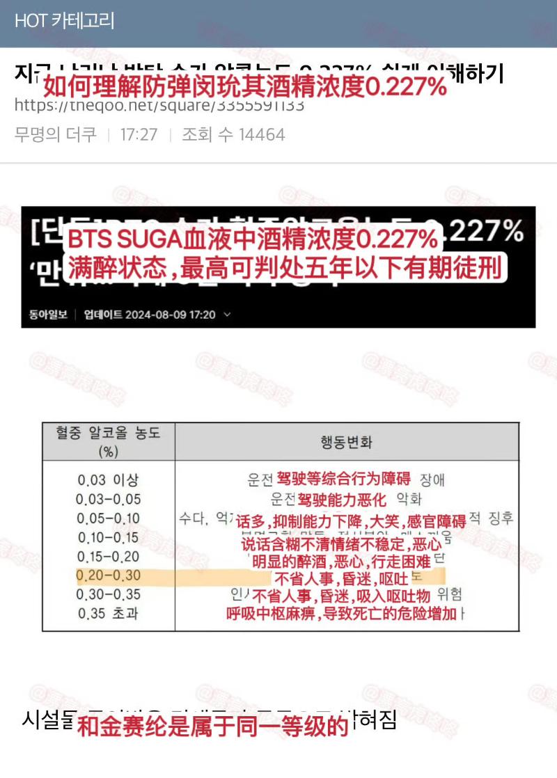 另外,韓媒東亞日報的采訪也透露了,首爾龍山警察署在事發現場,對SUGA進行的酒精濃度測試,顯示血液中的酒精濃度值為0.227%。據悉,當時SUGA陳述稱:「只喝了一杯啤酒,騎了一會兒車。」