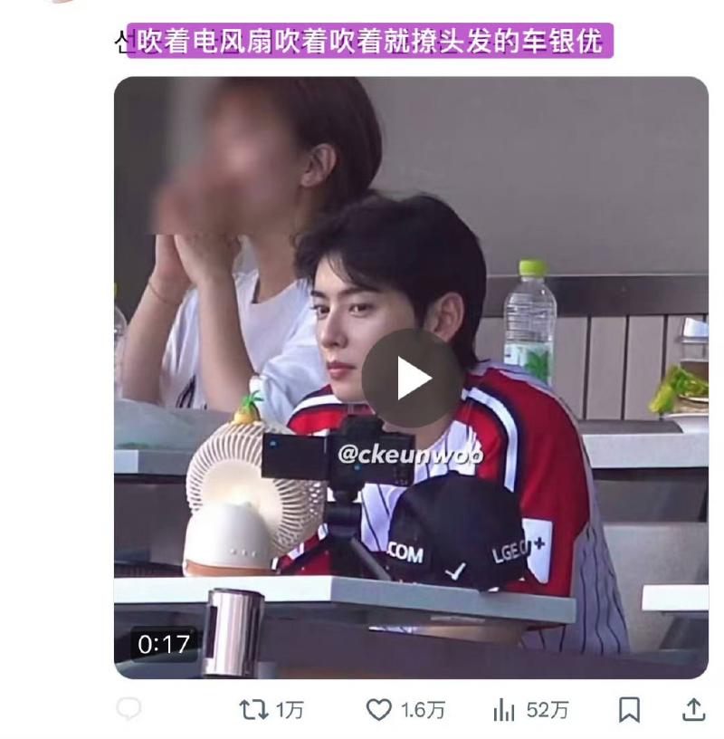 而獲得了上萬轉的,則是這一段視頻,車銀優在看台上,對著小風扇吹的視頻👇
