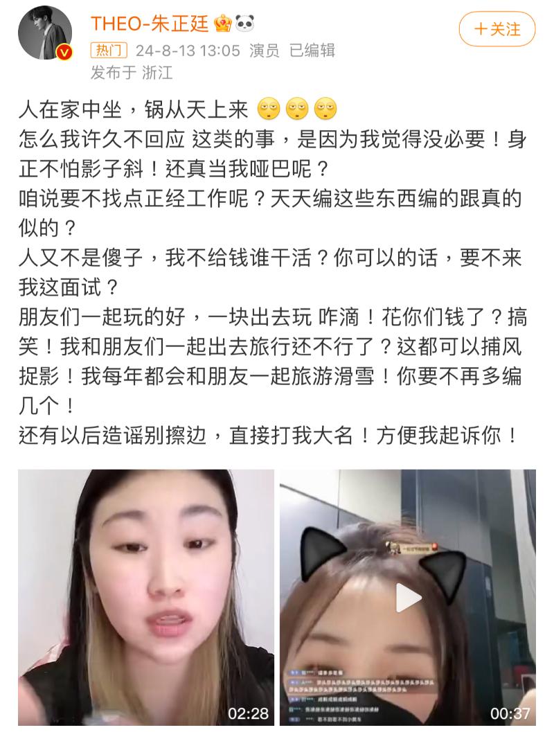隨著熱議,朱正廷在13號直接發文回懟,曬出兩段所謂的爆料視頻回應:「人在家中坐,鍋子從天上來……人又不是傻子,我不給錢誰幹活?」並稱自己是朋友一塊出去玩,最後喊話:「以後造謠別擦邊,直接打我大名!方便我起訴你!」