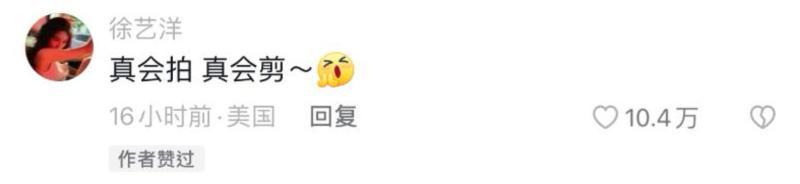 嗯,很好,滿滿狗糧,但沒想到這次徐藝洋居然來互動啦!沒錯,都知道官宣之後,徐藝洋不但沒有和黃子韜一樣換上情侶頭像,甚至從來沒有公開和韜總互動!沒想到這次居然亮相評論區,還化身誇誇小能手,稱讚自己男友「真會拍、真會剪!」