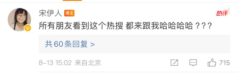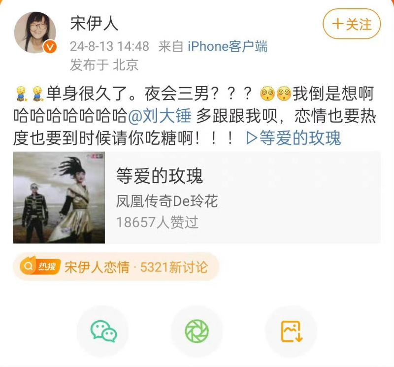 隨著熱議,宋伊人發文回應戀情傳聞,表示自己單身很久了。她開玩笑表示:「夜會三男?我倒是想啊」,並喊話八卦媒體:「多跟跟我呗,戀情也要熱度也要到時候請你吃糖啊。」