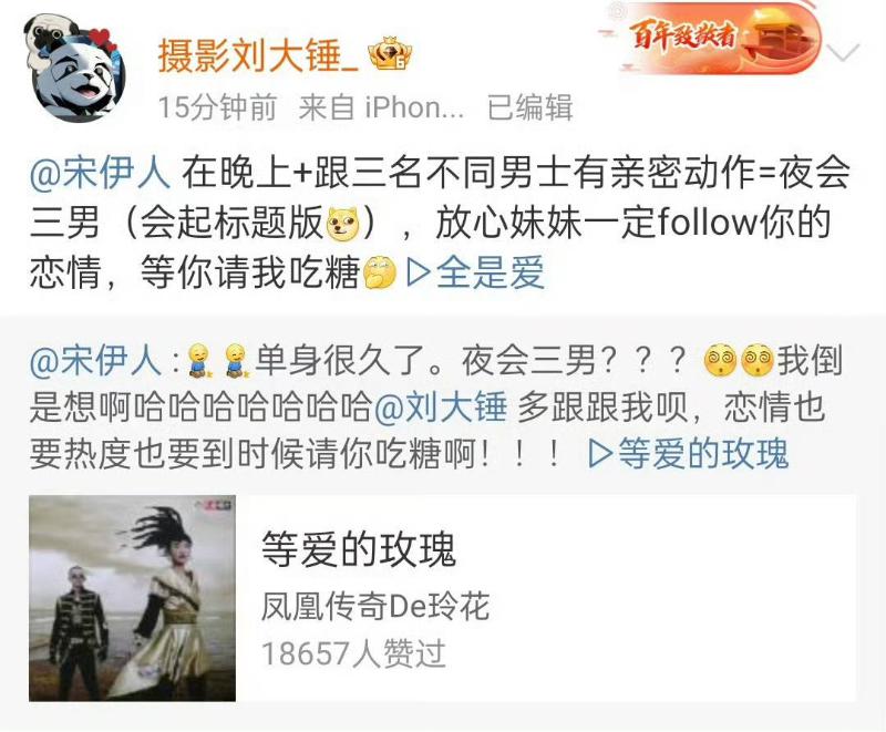 沒想到該狗仔也很剛,又發了一遍聚會圖回應宋伊人,還稱自己是“會起標題版”,表示:「放心一定follow你,等你請我吃糖」