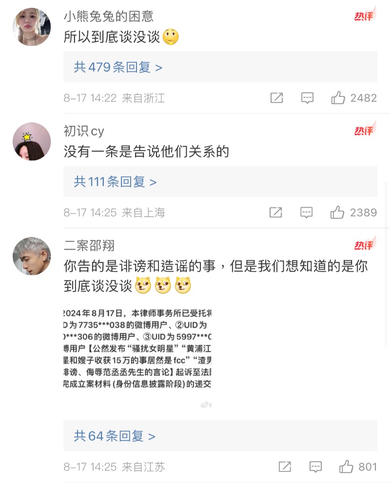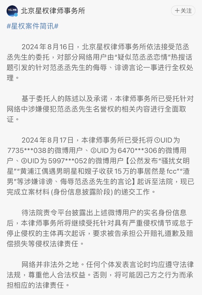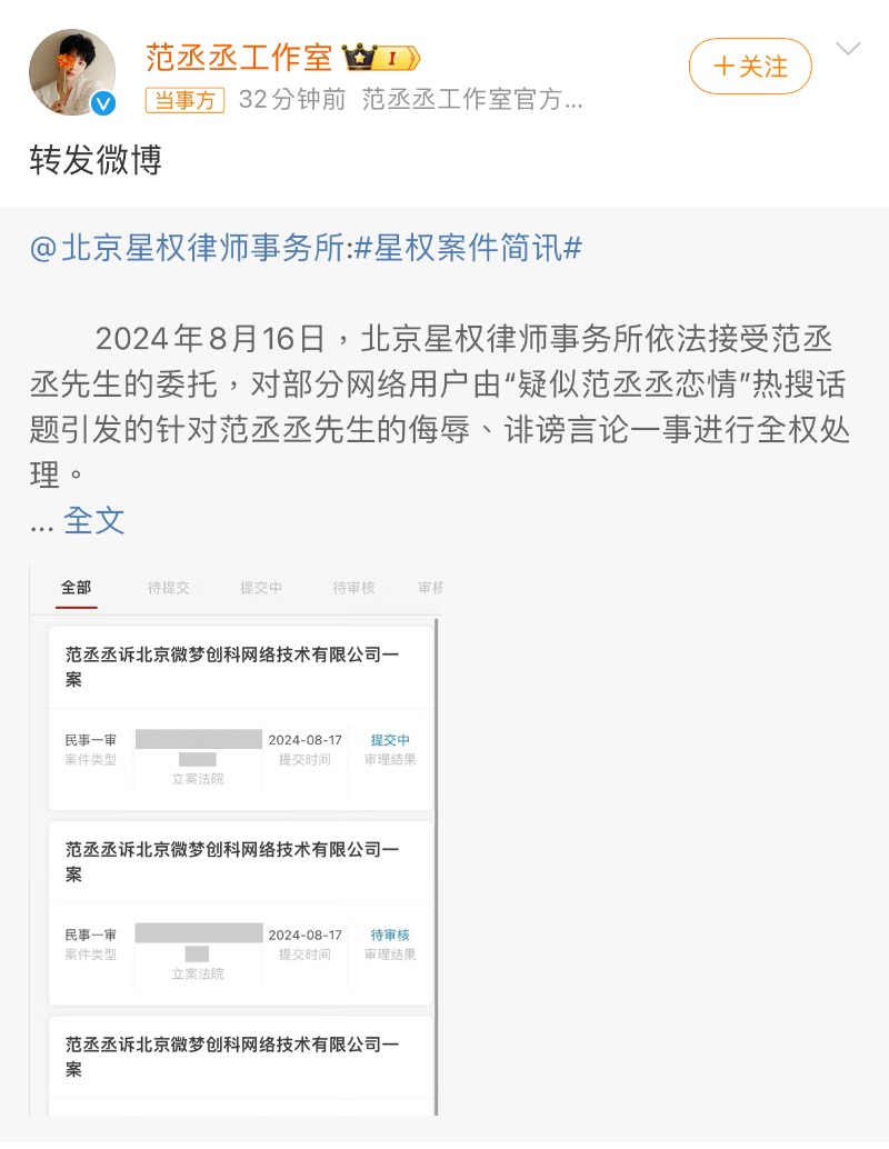 聲明中提及,工作室就近期因「范丞丞疑似戀情」引發的侮辱、誹謗相關言論進行上訴,委託事務所進行取證並上訴法院,目前已完成立案資料的遞交工作,被告將面臨公開賠禮道歉及賠償損失等侵權法律責任。