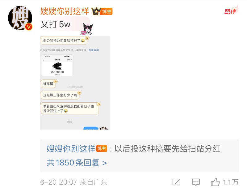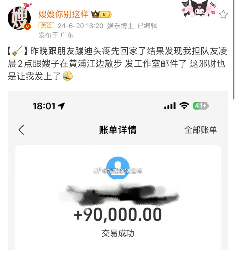 至於「黃浦江偶遇男明星和嫂子收穫15萬」,則是飯圈奇談!今年6月,有網友投稿表示自己深夜偶遇偶像的同公司隊友和嫂子散步,結果收到了經紀公司9萬元的封口費👇