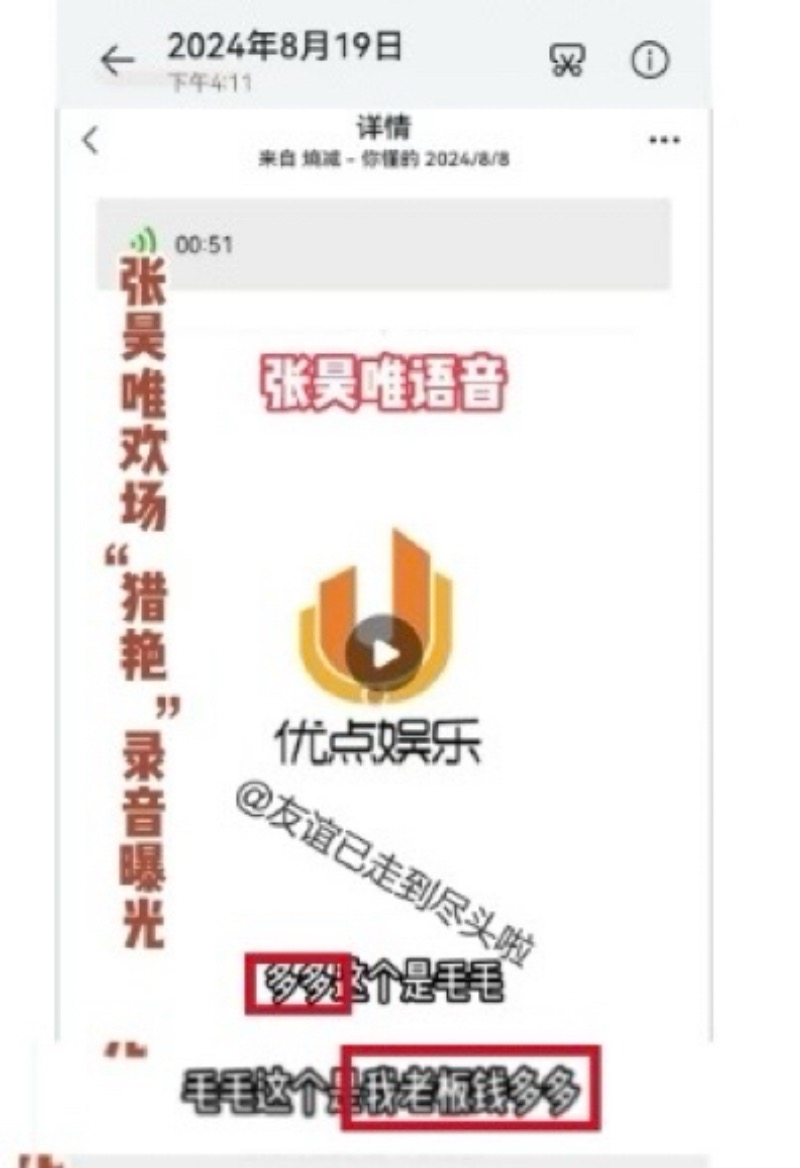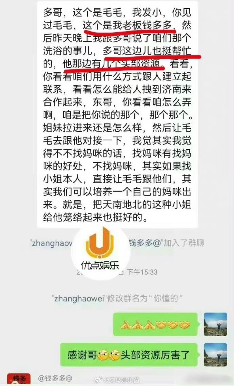 隨著聊天曝光,網友留意到張昊唯在語音中提及,自己的老闆是錢多多,手上握有頭部資源,兩人在商議如何將「小姐們」整合起來👇