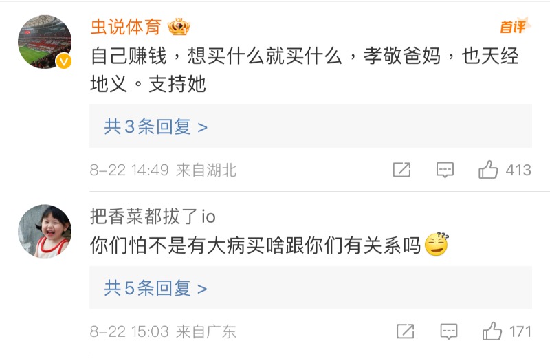 但也有網友回懟這些留言,認為全紅嬋有購物自由👇