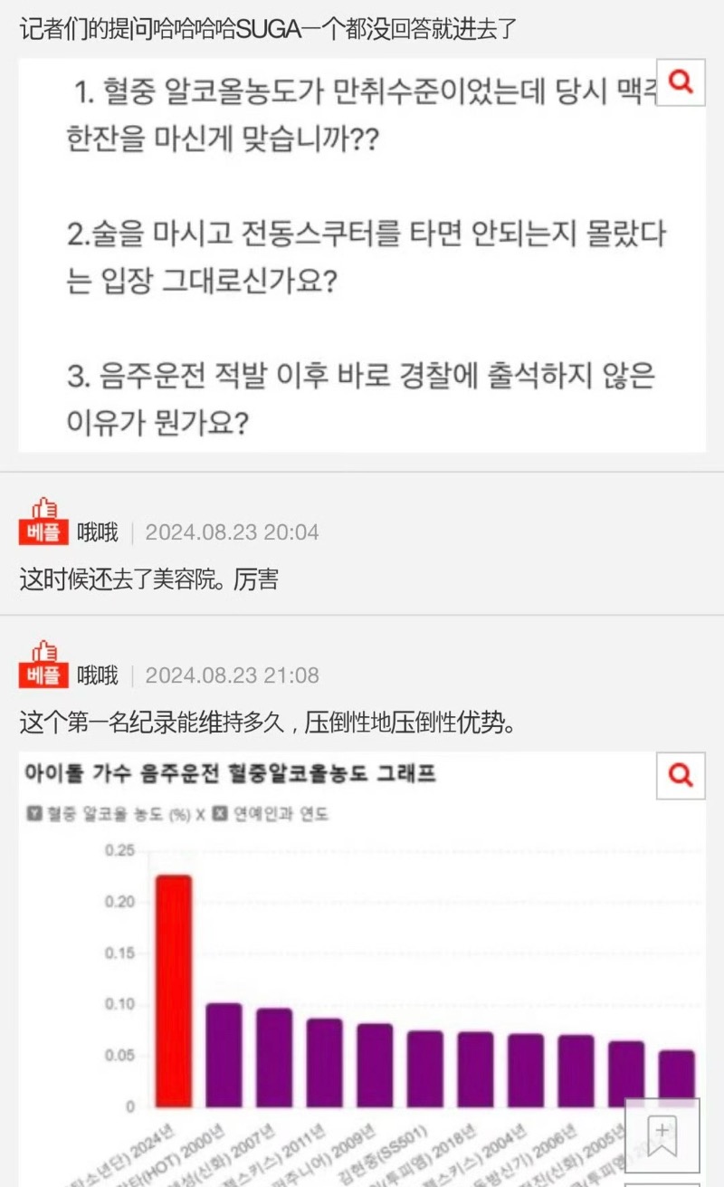 隨後,韓網整理了記者們提出的犀利問題,包括了:「血液中的酒精濃度是爛醉的程度,當時喝了一杯啤酒對嗎?」、「您是說不知道喝酒後不能騎電動踏板車的立場不變嗎?」,以及「酒後駕駛被揭發後,沒有立即到警察廳的理由是什麼?」