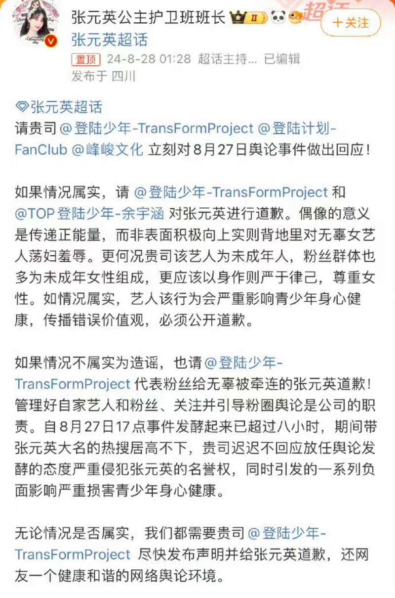 張員瑛中國粉絲站也發文維權,要求時代峰峻回應👇