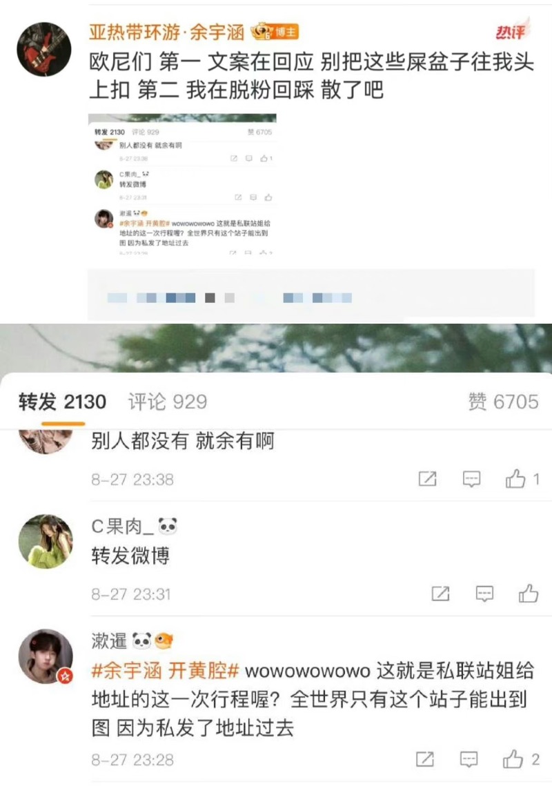 余宇涵大粉也發文脫粉,並曬出了余宇涵比中指的照片👇