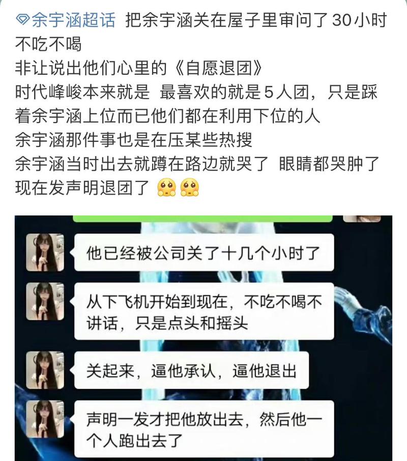 隨著余宇涵退團,其粉絲群中開始流傳,表示是時代峰峻將余宇涵關起來30多個小時不吃不喝逼問,硬是讓他說出自願退團👇