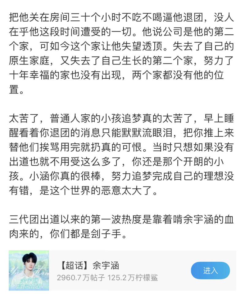 隨著余宇涵退團,其粉絲群中開始流傳,表示是時代峰峻將余宇涵關起來30多個小時不吃不喝逼問,硬是讓他說出自願退團👇