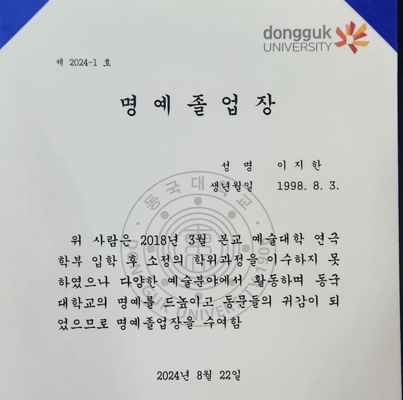 而近日,李智漢獲得了生前就讀的東國大學頒發名譽畢業證書,其母親帶著遺像出席了頒獎典禮,隨後公開了令人心碎的長文👇