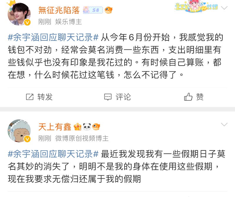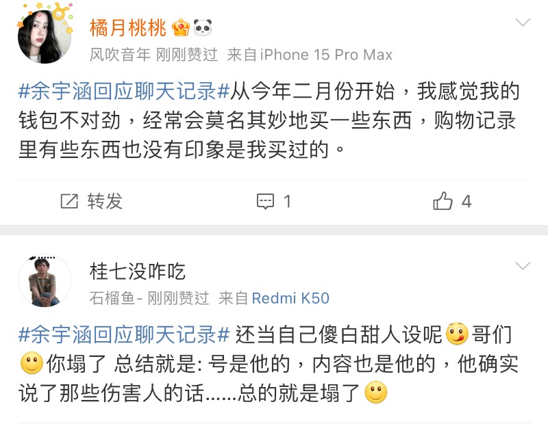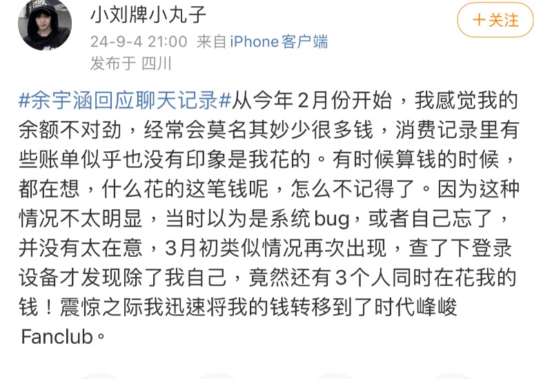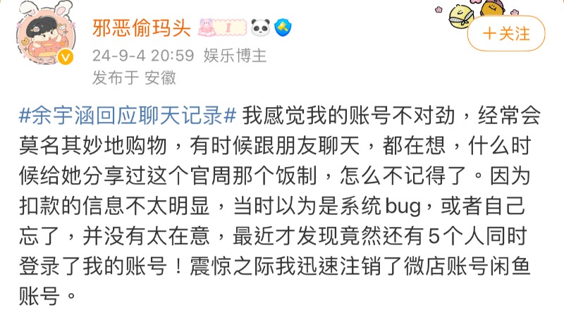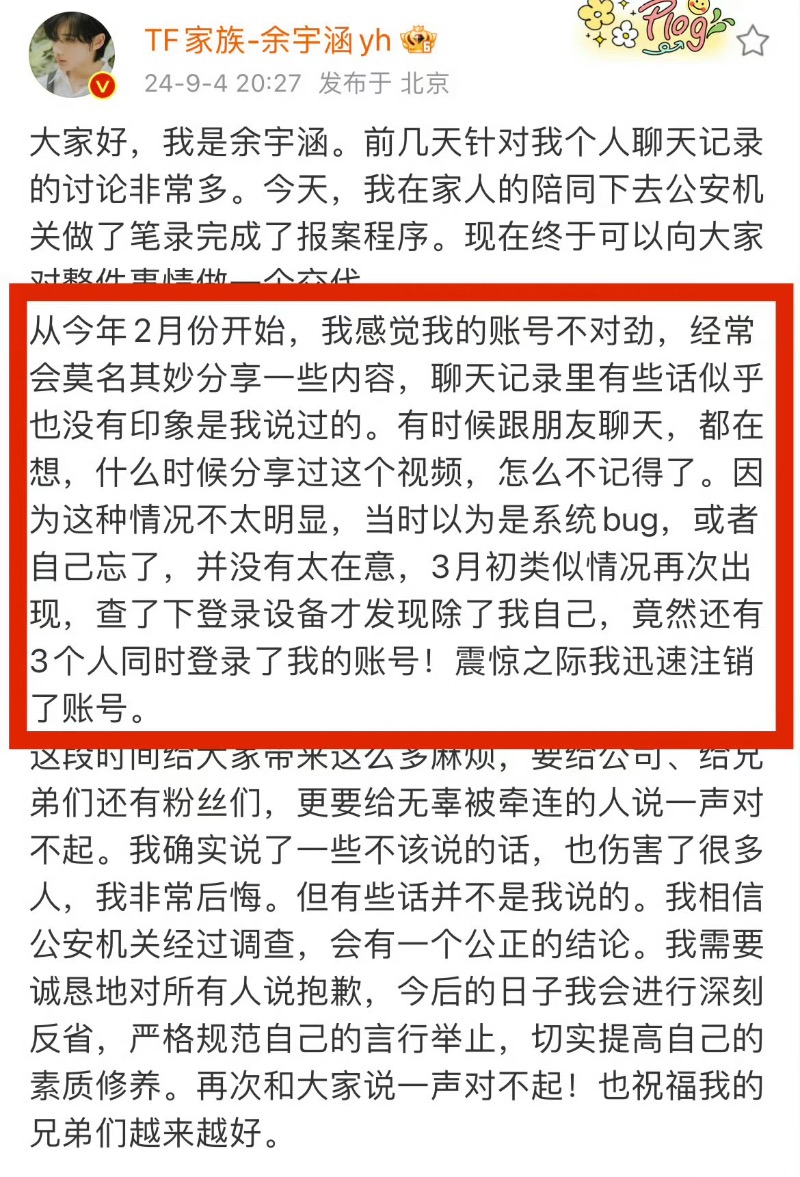 另外,余宇涵也發長文,回應了網傳的聊天記錄,提到了自己在2月份發現帳號有點不對勁,以為是系統bug,所以當時沒在意;3月份的時候才發現帳號除了自己,還有3個人同時登入了,隨即申請註銷帳號;並且給受到牽連的人還有粉絲道歉了。