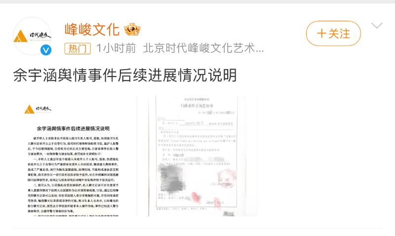 沈默數天之後,時代峰峻在4號晚上發文,公開了余宇涵事件後續,提到了已經報警!