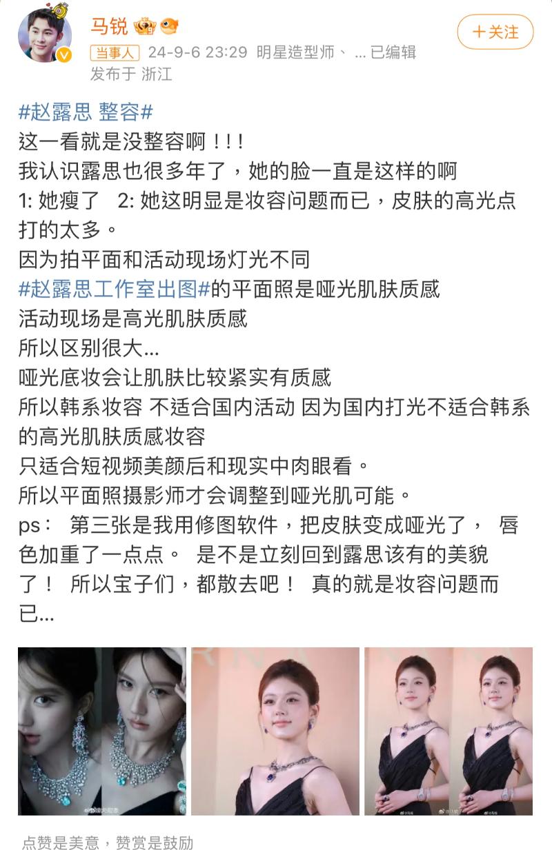 有化妝師下場為趙露思聲援,表示這很明顯是化妝問題,和整容無關👇