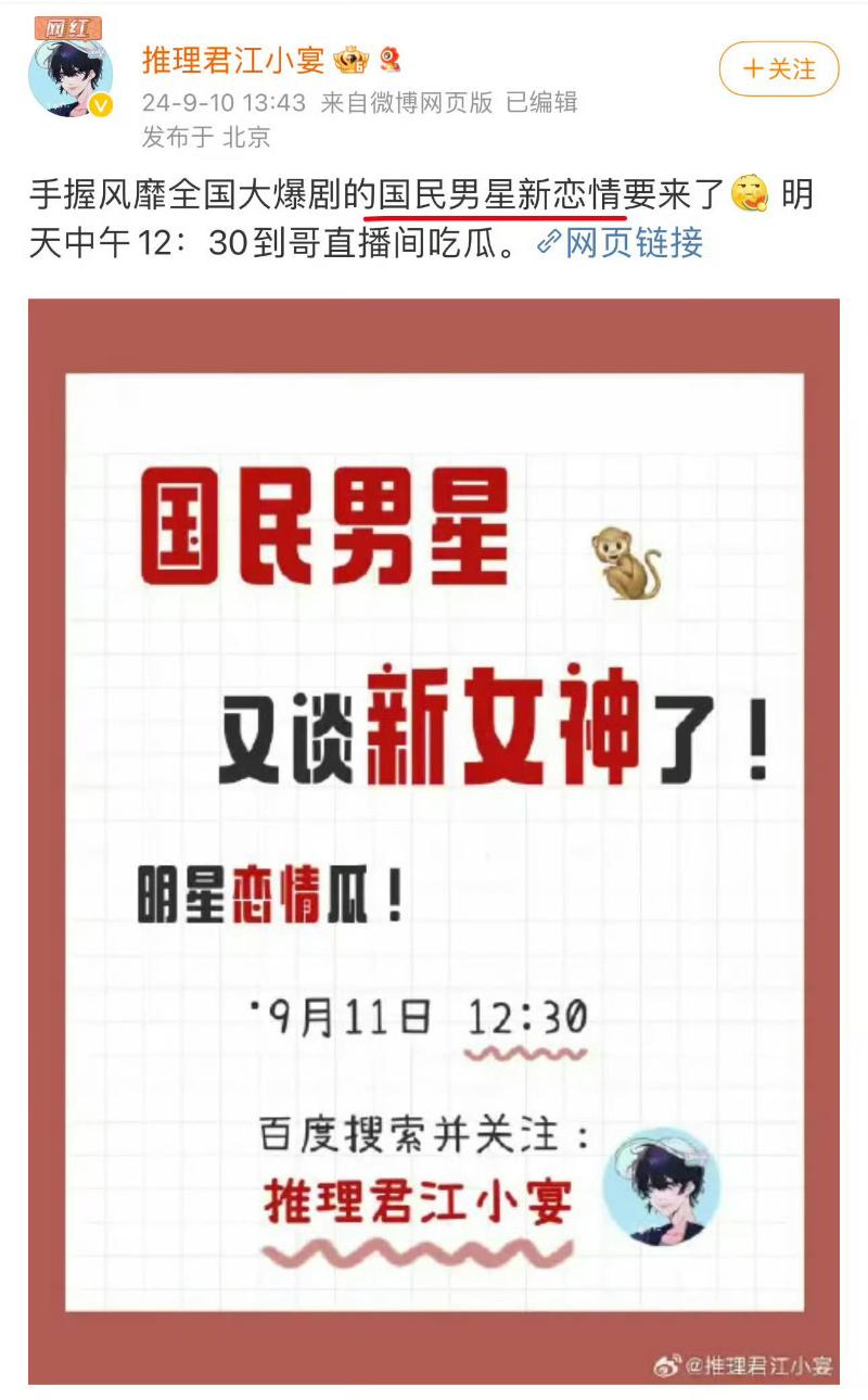 這…線索指向是不是太明顯了?是噠,都知道內娛狗仔喜歡先預告再爆料,只不過同時有這麼多狗仔聯動預告,實屬少見!是噠,先來看看,有狗仔發文預告,將在11號爆料「手握風靡全國大爆劇的國民男星」新戀情!
