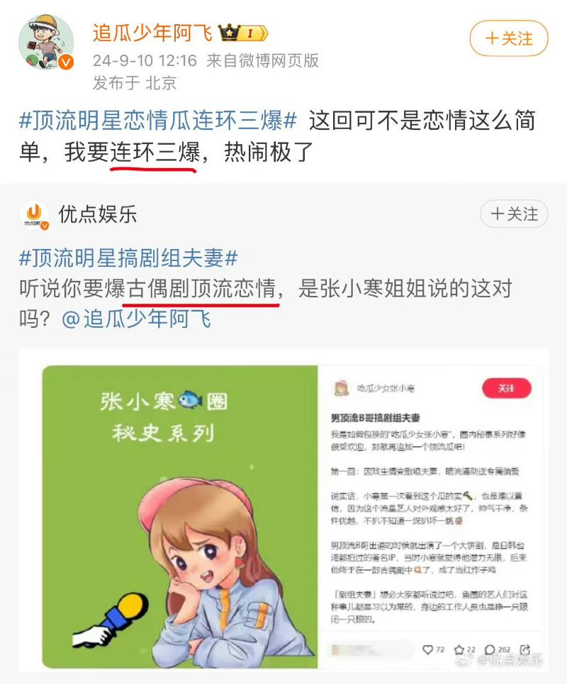 隨後,網友發現另一個狗仔早艾特這位狗仔,反問要爆的「古偶劇頂流戀情」,是不是另一個狗仔數天前的“爆料”對象?預告要爆料的狗仔再回復,表示「這回不是戀情這麼簡單,要連環三爆」!