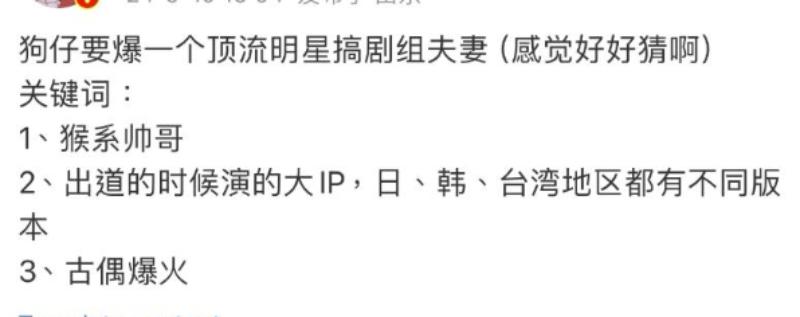 那,到底另一名狗仔爆料內容有什麼呢?提到的是男頂流搞劇組夫妻!這次爆料分上下回,當中提到的重點包括👇