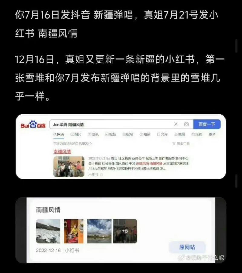 12月16日,華真更新小紅書曬了新疆雪景,和于適7月彈唱的背景雪堆幾乎一樣👇