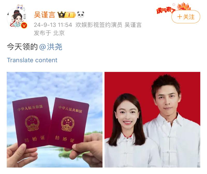 嗚哇!真的是一官宣就很炸裂啊!!!是噠,多次傳出緋聞的吳謹言、洪堯,在13號中午同步曬出結婚證,雙雙官宣結婚!!!