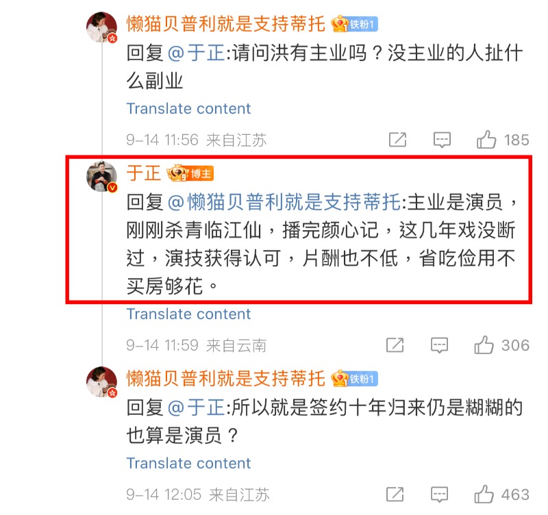 網友也反懟于正,洪堯主業是什麼,就有副業了!于正回應表示主業是演員,並提到:「片酬也不低,省吃儉用不買房夠用」