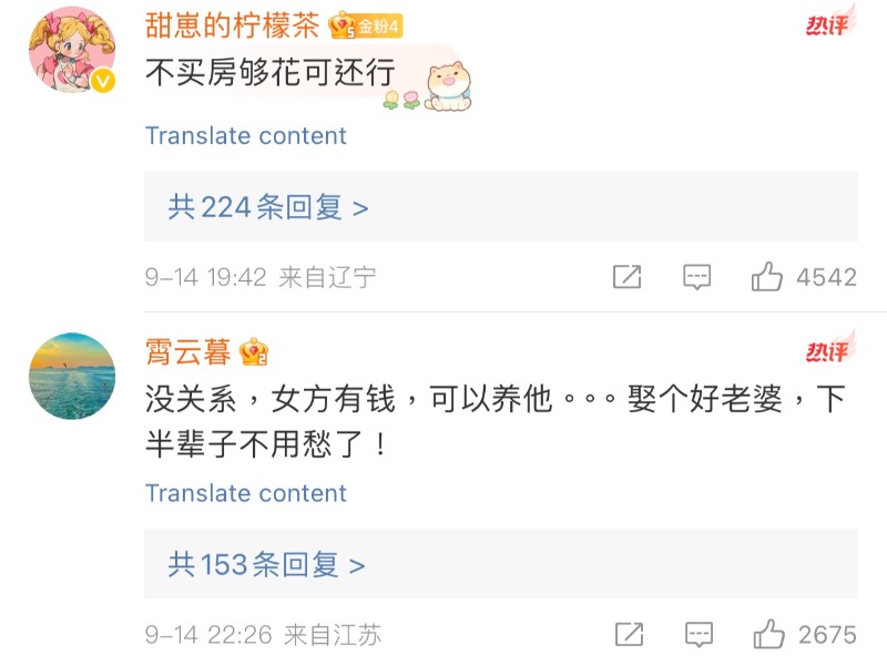 對比女方,男方不僅風評不好,財力似乎也比女方差,因此就有粉絲在老闆于正微博留言,讓他提醒吳謹言做好婚前財產公證,不要被騙了!
