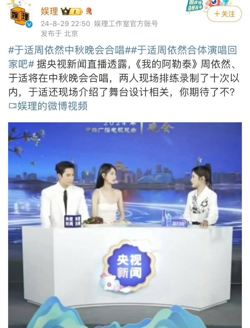 當時于適是和《我的阿勒泰》女主周依然一起演出電視劇插曲《回家吧》,兩人甚至搶先出現在央視新聞直播中👇