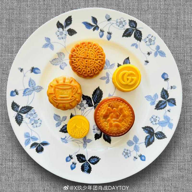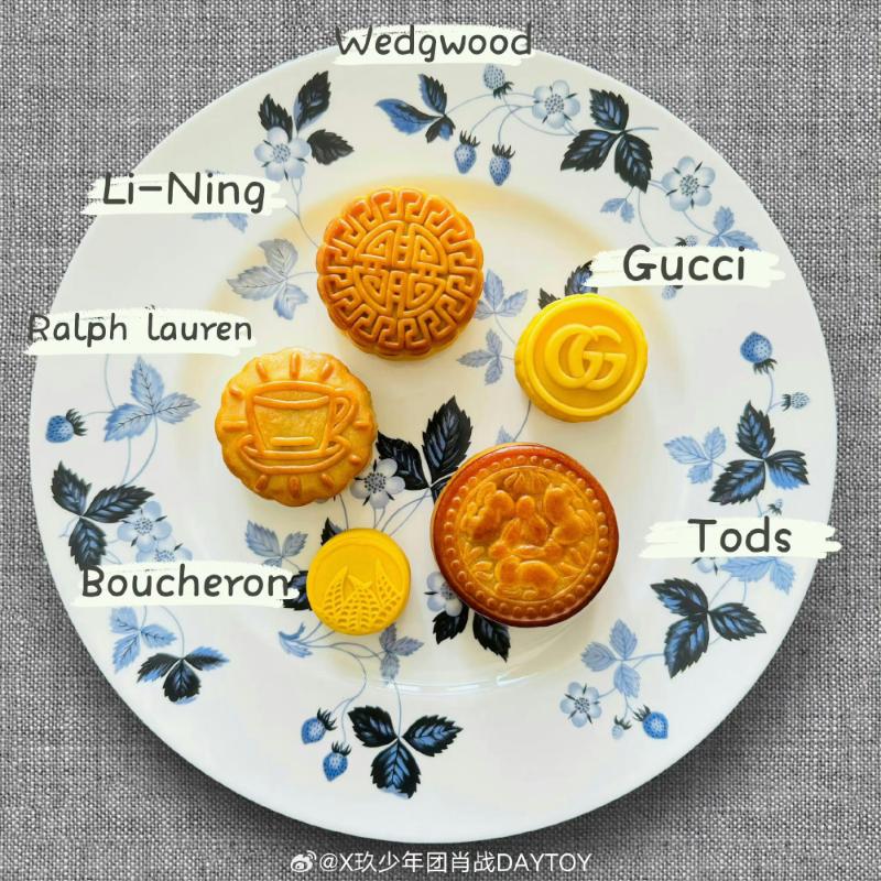 但同樣很嚴謹的粉絲,立刻扒出這上面的月餅來頭都不小,全都是肖戰代言的品牌!從最旁邊開始就是Gucci的、順序是Tod’s,接著是寶詩龍、Ralph Lauren,最後是李寧,就連拿來裝月餅的盤子,也是自己代言的英國皇室御用百年工藝瓷器Wedgwood!
