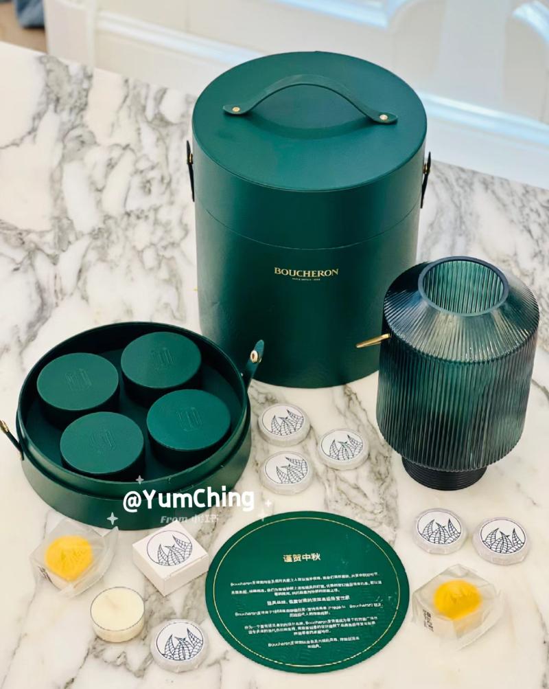 接著是走設計路線的寶詩龍中秋禮盒,裡面含有一個很大的玻璃手提燈,搭配品牌經典的墨綠色,十分摩登復古。四個月餅都單獨用質感很高的小盒子裝起來,視覺上真的超典雅👇