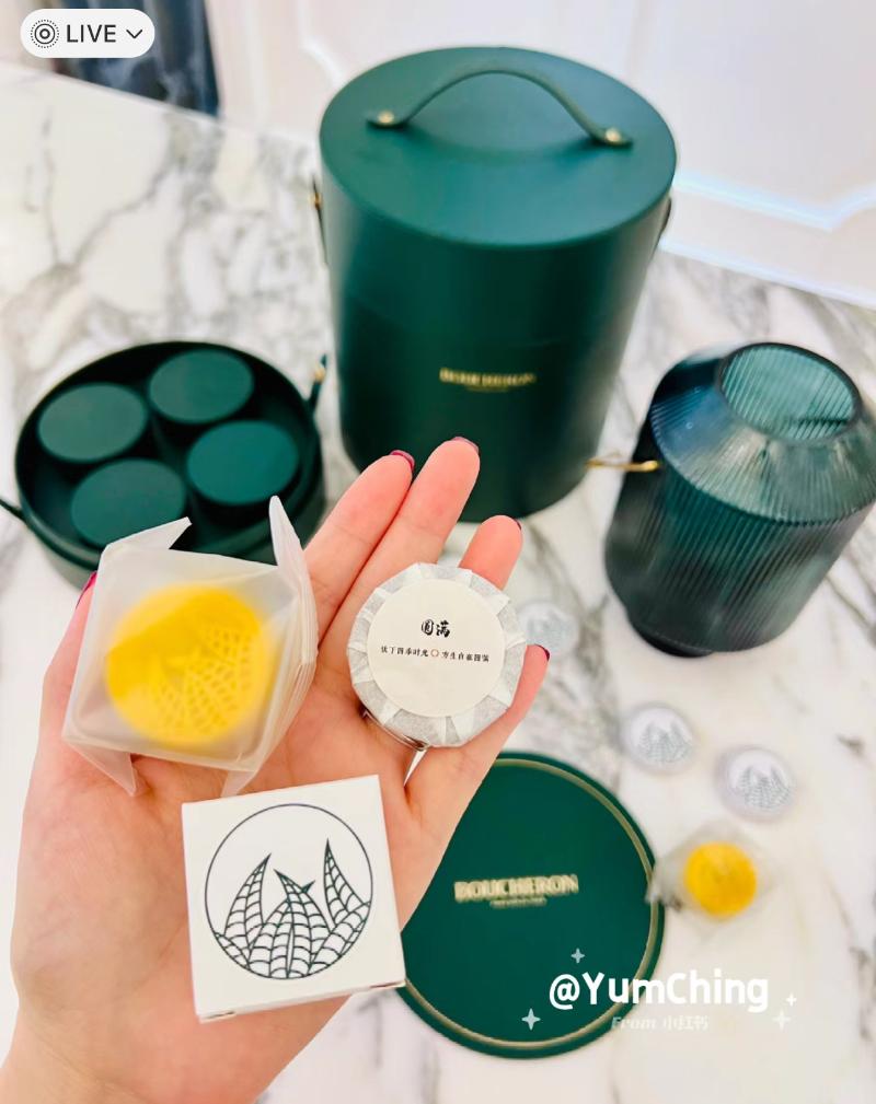 接著是走設計路線的寶詩龍中秋禮盒,裡面含有一個很大的玻璃手提燈,搭配品牌經典的墨綠色,十分摩登復古。四個月餅都單獨用質感很高的小盒子裝起來,視覺上真的超典雅👇