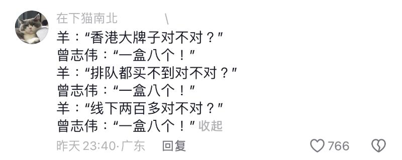 網友扒出9月初,曾志偉曾出現在直播間介紹美誠月餅“這個送禮是非常好”,而小楊哥立刻接話:「他們在香港都知道,香港美誠在線下賣700塊錢一盒」。他在直播中還提到,2分鍾時間賣出了2.4萬單。