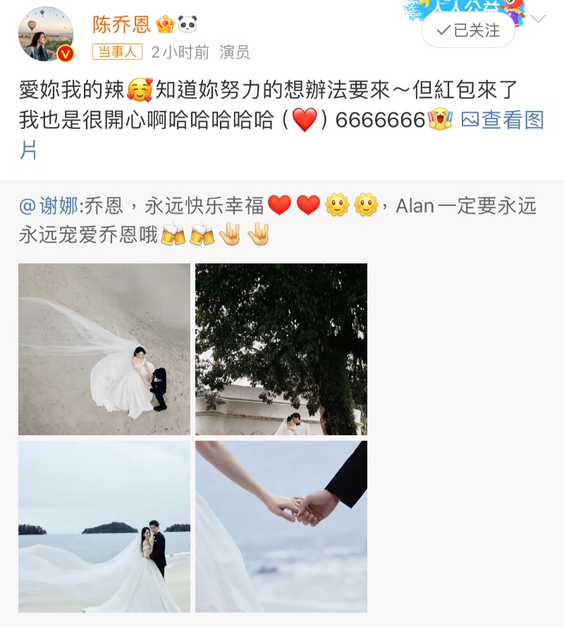 而陳喬恩隨後也轉發了謝娜貼文,謝謝她轉帳的紅包👇