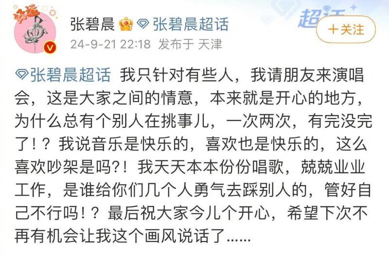 對此,張碧晨發文教育自家粉絲,表示她請朋友來演唱會,本來是開心的地方,為什麽總有個別人在挑事,一次兩次,有完沒完了,她兢兢業業工作,是誰給你們幾個人勇氣去踩別人,管好自己不行嗎?