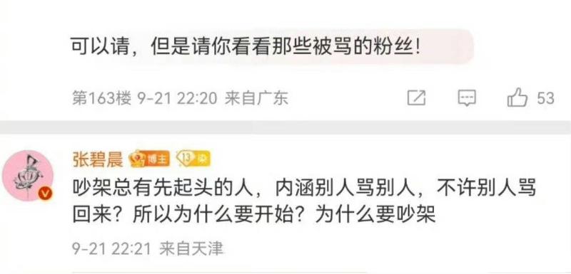 對此粉絲評論:「請你看看那些被罵德粉絲。」張碧晨回複:「吵架總有先起頭的人,內涵別人罵別人,不許別人罵回來,所以為什麽要開始?為什麽要吵架?」