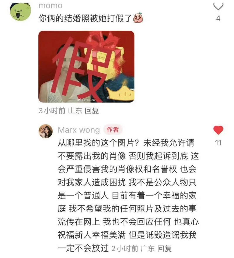 更好笑的是,葉珂前夫在某個博主下面要求刪除照片,確認了結婚登記照片就是本人👇